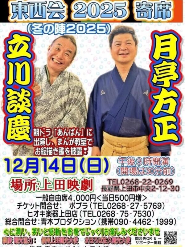 クリックで拡大 《長野》東西会2025冬の陣立川談慶・月亭方正 日 時 2025年12月14日 (日) 開演:14:30(開場:15:00) 会 場 上田劇場 料 金 予約:4,000円(当日:5,000円) お問合せ チケット問合せ:ポプラ(TEL0268-27-5769) ヒオキ楽器上田店 (TEL0268-75-7530) 総合問合せ:青木プロダクション(携帯090-4462-199 前の公演八光•方正二人会 公演情報一覧 次の公演三遊亭圓歌•月亭方正二人会