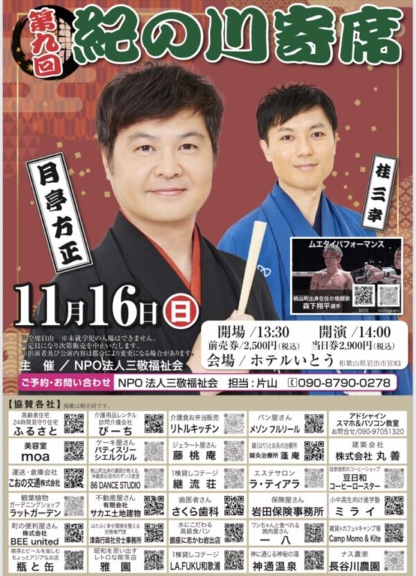 クリックで拡大 《和歌山》第9回紀の川寄席 日 時 2025年11月16日 (日) 開演:14:00(開場:13:30) 会 場 ホテルいとう 料 金 予約:2,500円(当日:2,900円) お問合せ NPO法人三敬福祉会 担当:片山 090-8790-0278 前の公演成相山成相寺月亭方正紅葉ライトアップ落語会 公演情報一覧 次の公演月亭方正一門会