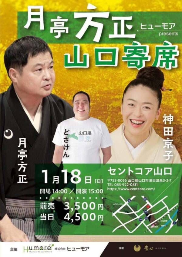 クリックで拡大 《山口》月亭方正山口寄席 日 時 2026年1月18日 (日) 開演:15:00(開場:14:00) 会 場 セントコア山口 料 金 予約:3,500円(当日:4,500円) 前の公演方正の頭の中 公演情報一覧 次の公演三遊亭圓歌•月亭方正二人会