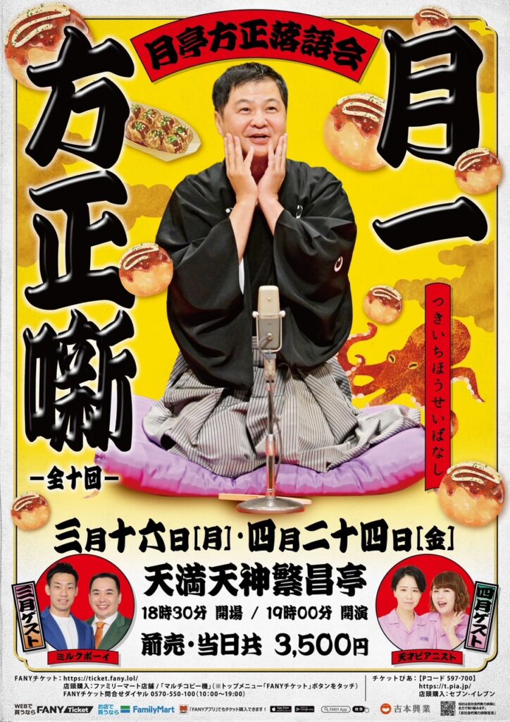 クリックで拡大 《大阪》月亭方正落語会 月一方正噺 日 時 2026年3月16日 (月) 開演:19時00分(開場:18時30分) 会 場 天満天神繁昌亭 料 金 予約:3,500円(当日:3,500円) 出 演 月亭方正 ミルクボーイ(ゲスト) チケットは、以下のサイトでもお求めいただけます チケットぴあチケットよしもと 前の公演月亭方正落語会 月一方正噺 公演情報一覧 次の公演東西特選二人会