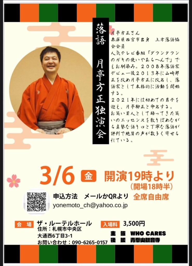 クリックで拡大 《北海道》月亭方正 独演会 日 時 2026年3月6日 (金) 開演:19時00分(開場:18時30分) 会 場 ザ・ルーテルホール 料 金 予約:3,500円(当日:3,500円) 全席自由席 お問合せ 090-6265-0157 申込方法 チラシのQRコードより または✉️メールyonemoto_ch@yahoo.co.jpより 前の公演月亭方正落語会 月一方正噺 公演情報一覧 次の公演月亭方正落語会 月一方正噺