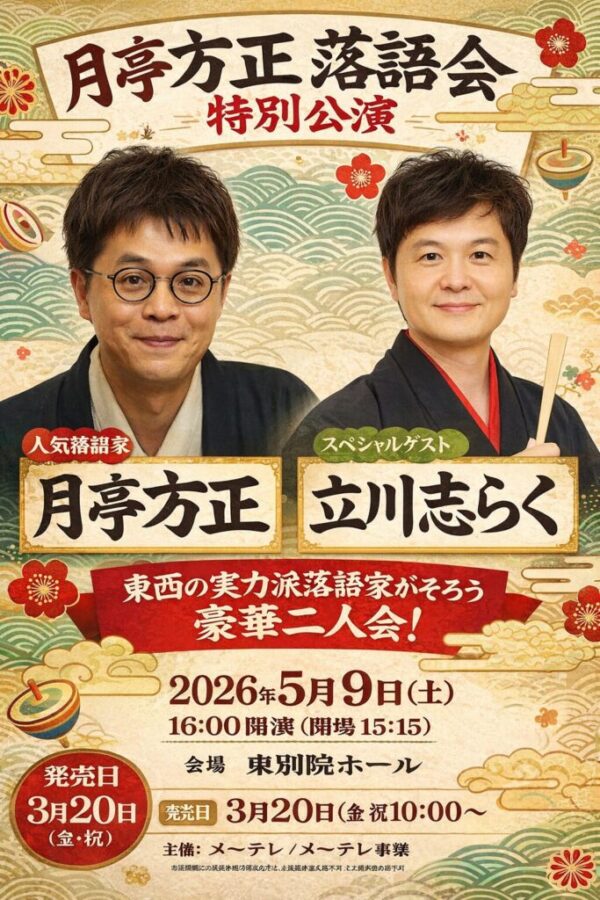 クリックで拡大 《愛知》月亭方正 落語会 特別公演 日 時 2026年5月9日 (土) 開演:16時00分(開場:15時15分) 会 場 東別院ホール 料 金 予約:4,800円(当日:4,800円) 全席指定 3/20(10:00より発売) 出 演 立川志らく(スペシャルゲスト) 月亭方正 お問合せ FUJI鍋 ☎︎ 072-355-8286 ✉️ km@fujinabe.com 前の公演ごくらくご 公演情報一覧 次の公演第33回 彦八まつり