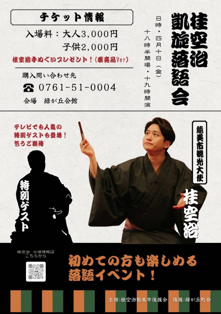 クリックで拡大 《石川》桂空治 凱旋落語会 日 時 2026年4月10日 (金) 開演:19時00分(開場:18時30分) 会 場 緑が丘会館(能美市) 料 金 予約:3,000円(当日:3,000円) 子供2000円 出 演 桂空治(能美市観光大使) 月亭方正(特別ゲスト) お問合せ 緑が丘会館 ☎︎0761-51-0004 前の公演米團治 方正 二人会 公演情報一覧 次の公演月亭方正落語会 月一方正噺