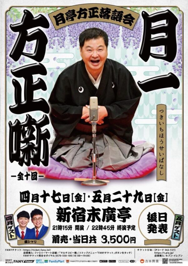 クリックで拡大 《東京》月亭方正落語会 月一方正噺 日 時 2026年4月17日 (金) 開演:21時15分 会 場 新宿末廣亭 料 金 予約:3,500円(当日:3,500円) 22時45分 終演予定 出 演 月亭方正 銀シャリ(ゲスト) チケットは、以下のサイトでもお求めいただけます チケットぴあチケットよしもと 前の公演桂空治 凱旋落語会 公演情報一覧 次の公演月亭方正落語会 月一方正噺